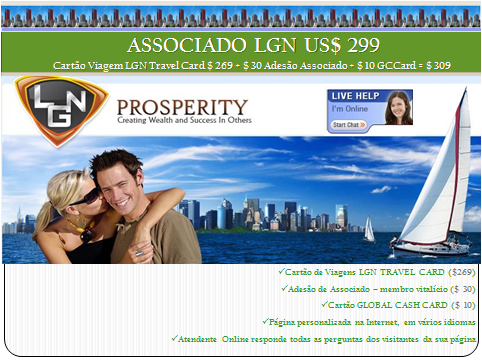 Quando você se associa à LGN paga US$ 299 (US$ 269 Cartão LGN + US$ 30 de taxa de adesão) + US$ 10 Global Cash Card e recebe seu Global Cash Card que te dá direito a reservar hospedagem em um dos 3.500 destinos em todo o mundo, por 8 Dias / 7 Noites, para 02 a 08 pessoas. Recebe também, uma página personalizada na Internet, em vários idiomas. Na página inicial do site existe um link para que seu associado faça perguntas e tire suas dúvidas. E tem a obrigação de colocar 2 pessoas no negócio. quando essas duas pessoas colocarem mais duas, você ganha US$ 777 + outro Cartão LGN Global Cash Card, além de uma nova posição na próxima Matriz, sem custo algum para você. Éxiste ainda, a possibilidade de receber o Bônus Car e outros prêmios. Além de ganhar uma loja virtual totalmente sua. O preço total dos produtos vendidos na loja virtual são depositados integralmente em sua conta.