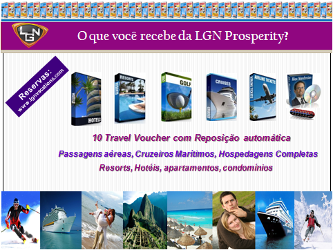 Quando você ingressa na LGN, você se torna um membro vitalício e terá muitos benefícios. Além de receber uma loja virtual integralmente sua, você recebe 100% de comissão sobre tudo o que for vendido. Recebe também, o seu Global Cash Card que te dá direito a 8 Dias e 7 Noites, para 02 a 08 pessoas, em um dos 3.500 destinos, hospedando-se nos melhores hotéis e resorts de primeira linha no mundo todo. E mais, você terá depositado no seu back Office 10 Travel Vouchers, que te dão descontos incríveis em todos os itens das suas férias, cada um com uma finalidade diferente: Descontos em Passagens Aéreas, Descontos em Aluguel de Carros, Descontos em Cruzeiros, etc...Quando você utiliza um desses vouchers, a empresa, imediatamente, faz a reposição automátia do mesmo.
