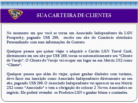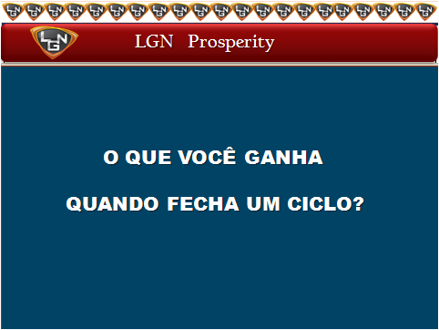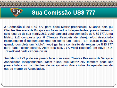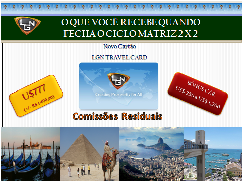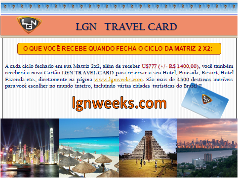 Quando fecha o ciclo da sua Matriz 2 X 2, você recebe US$ 777 + 1 Novo Cartão LGN Travel Card, um reingresso na Nova Matriz sem custo algum para você e a poossibilidade de receber Bônus Car.