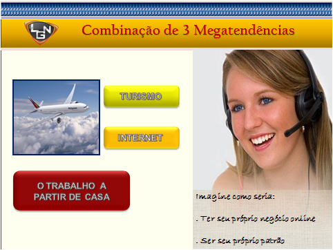 A LGN reuniu 3 Megatendências, o TURISMO, que cresce com crise ou sem crise. Na crise, as pessoas viajam para desestressar, quando as coisas vão bem, elas viajam para aproveitar a boa maré. A INTERNET veio para ficar! A economia brasileira estará quase que totalmente informatizada em 3 anos. Os empregos se tornarão cada vez mais escassos, se você não tiver uma fonte de renda pela internet, em poucos anos, não terá mais como se sustentar. Por isso, precisamos encontrar nosso caminho na Internet, buscar as boas oportunidades de negócio e construir uma renda sólida, garantindo assim o futuro de nossos filhos. O TRABALHO A PARTIR DE CASA é a tendência do momento. Trabalhar em casa, tem muitas vantagens. Mas, você precisa ter disciplina e dedicar algumas horas por dia para fazer do seu negócio um sucesso!