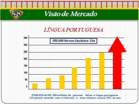 O mercado de Língua Portuguesa é de 300 milhões de pessoas e ainda está praticamente inexplorado. Você pode atingir países que falam português: Brasil, Portugal, Timor Leste, e também, existem milhares de brasileiros vivendo no exterior e que estão à procura uma boa oportunidade de negócios que lhes proporcione uma renda mensal segura.