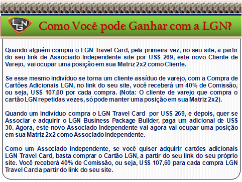 1) Você pode ser um Cliente de Varejo (esta é uma opção para quem deseja comprar a viagem para utilização, mas não pretende desenvolver o negócio), o Cliente de Varejo paga US$ 269 pelo Cartão de Viagem LGN Travel Card. Cada cartão vendido através do link do seu site, você recebe US$ 107,60 de comissão, e este Cliente de Varejo irá ocupar um lugar na sua matriz, ajudará você a ciclar e ganhar US$ 777.