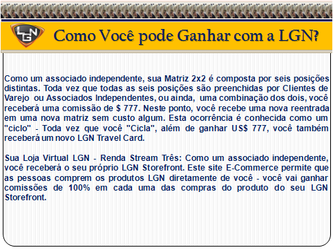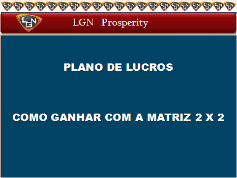 Na LGN Prosperity você paga US$ 299 (US$ 269 pelo Cartão LGN Travel Card + US$ 30 pela sua Adesão como Associado) e ganha uma posição na Matriz 2 x 2. No sistema de Matriz 2 X 2, você coloca 2 pessoas no negócio e esses 2 colocam mais 2 e pronto, você fechou o ciclo, ganhou US$ 777 + 1 novo Cartão LGN Travel Card e uma posição garantida na próxima Matriz (adicional), sem custo algum para você.